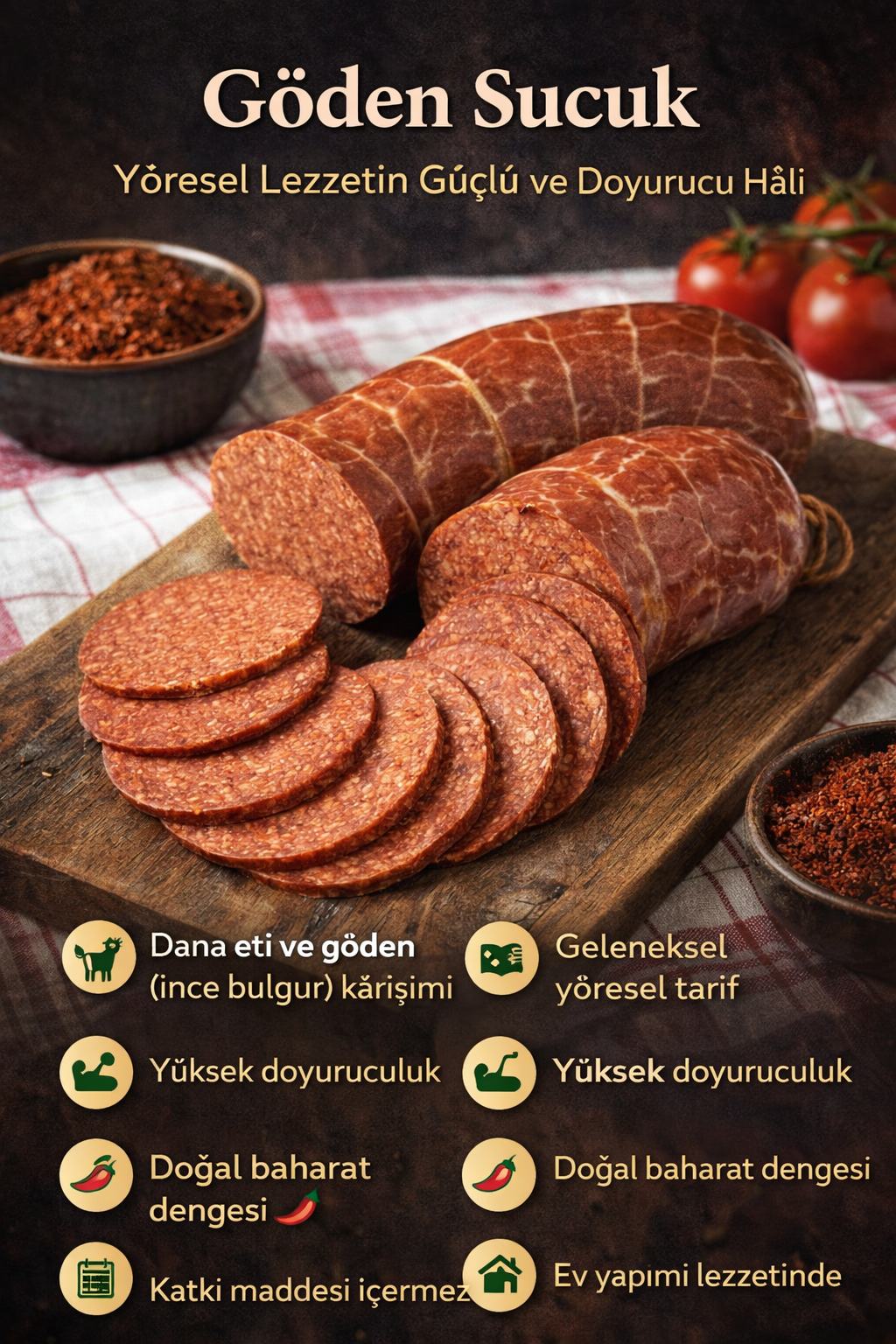 Özellikle İç Anadolu ve Doğu Anadolu mutfağında önemli bir yere sahip olan göden sucuk, doğal üretim yöntemi ve katkısız içeriğiyle yöresel tatları sevenler için ideal bir tercihtir. 🍽️✨